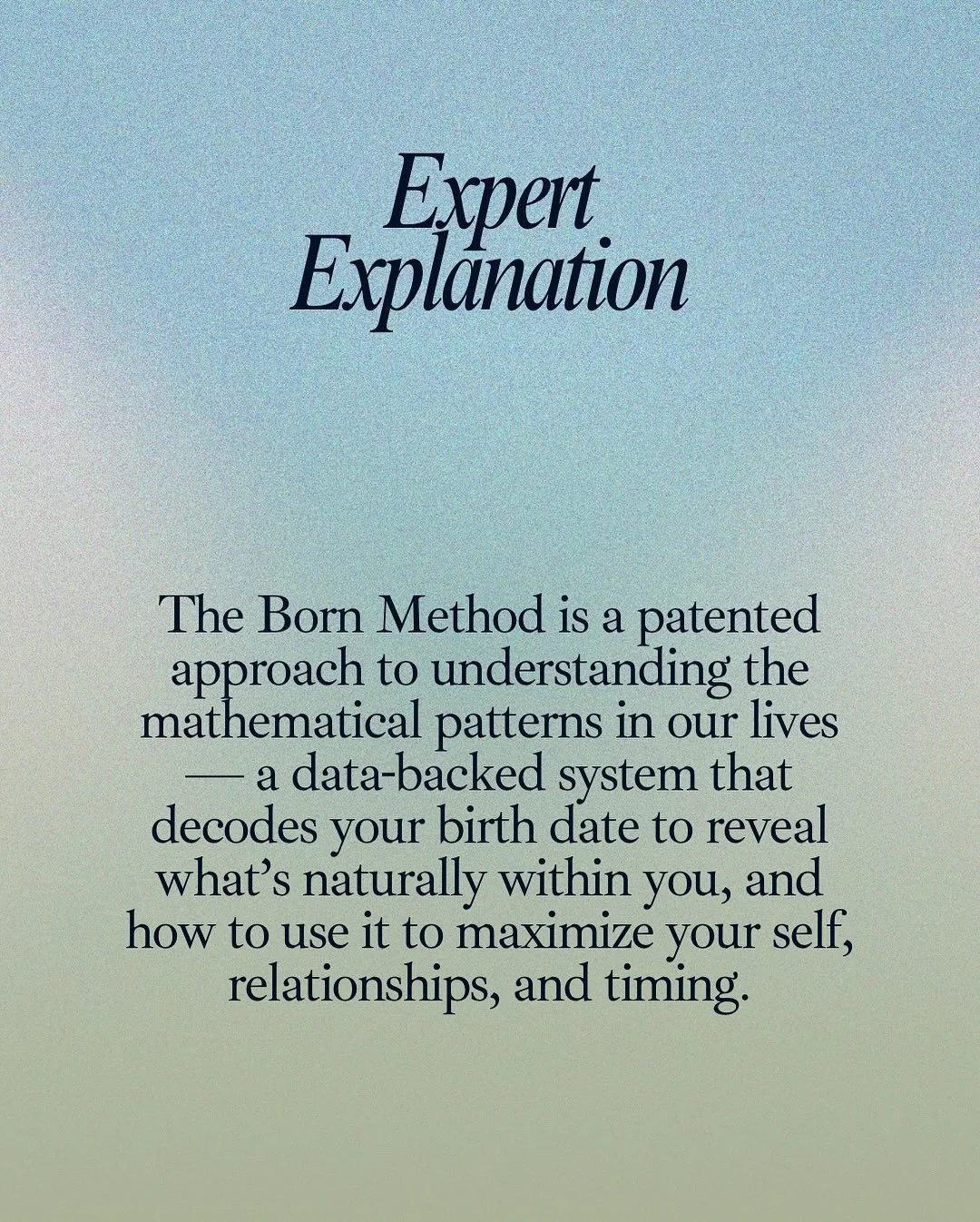 The Born Method™ is a patented system that blends mathematics, behavioral data, and ancient wisdom from birth dates to give you clarity and confidence during times of change — from career pivots and growing your family to expanding your business and strengthening your relationships with the people who matter most.